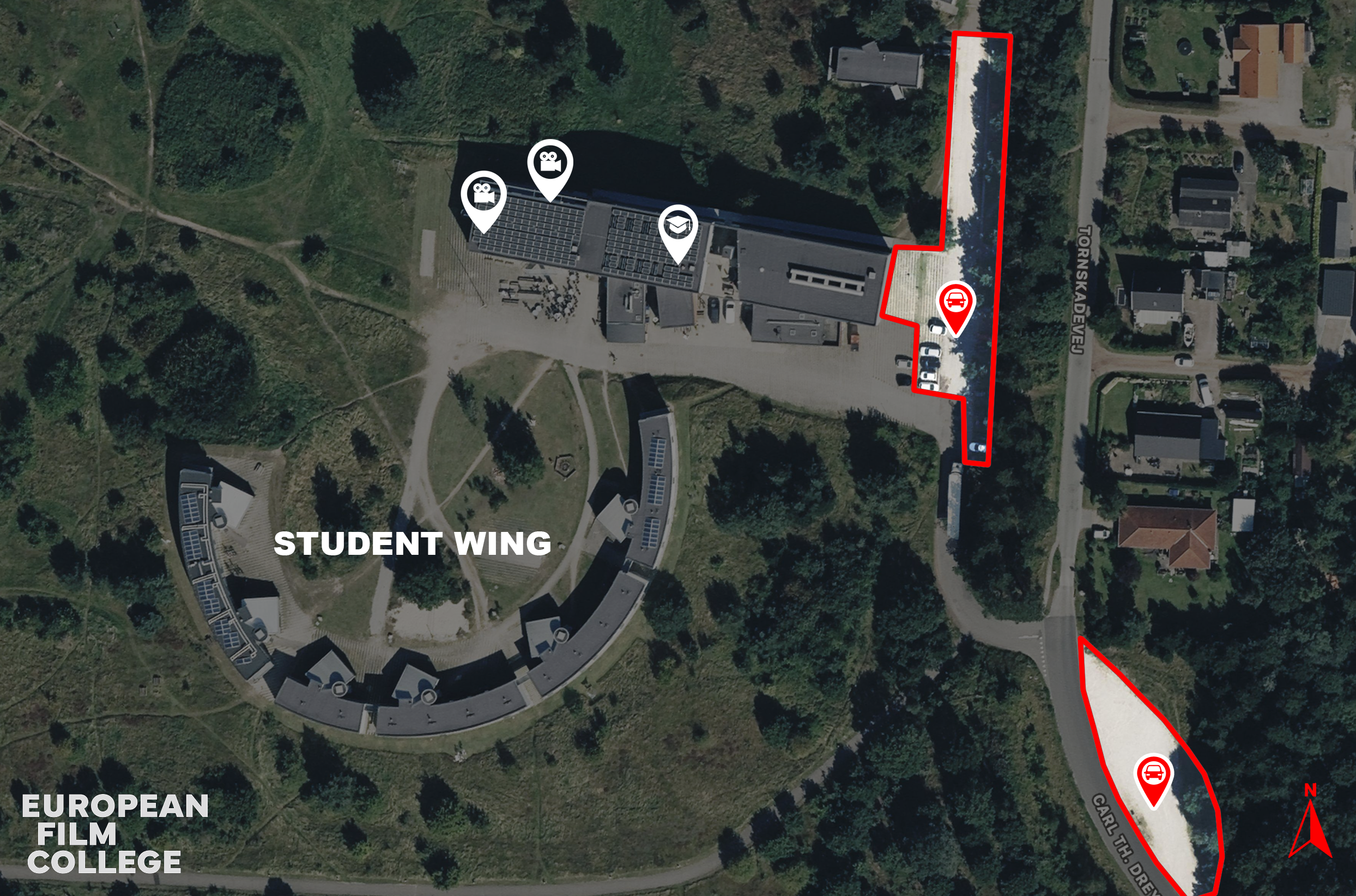 Skolen har sine egne parkeringspladser, som kan ses på billedet her. Antallet af pladser er dog begrænset, og de fordeles efter først-til-mølle-princippet. Vi anbefaler derfor, at man ankommer i god tid, hvis man ønsker at parkere på skolens område.